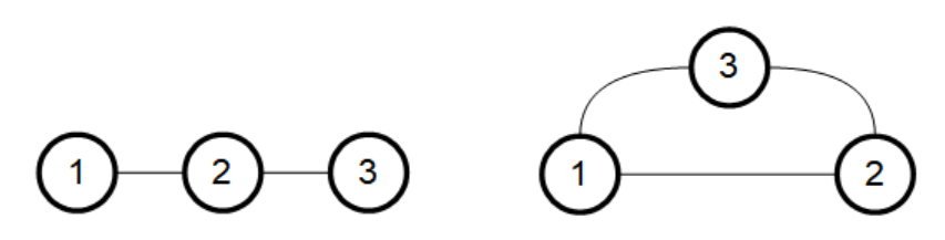We now go to the first nontrivial case – there are 3 rides in the park. We may assume that all the rides in the park are connected by roads, since otherwise there will be rides that we can never reach, and this is just cruelty. So under this assumption we have two options – either each two rides are directly connected by a road, or we have one ride which is connected to the other two, which are not directly connected.