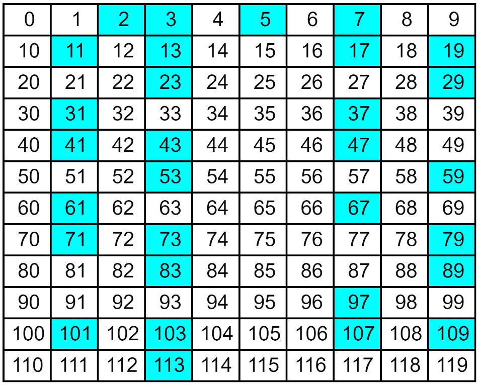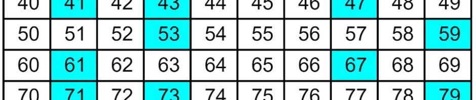 - The columns for the digits 0, 4, 6 and 8 don’t have any prime numbers.