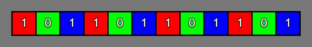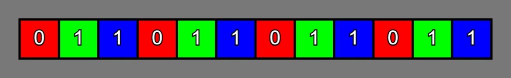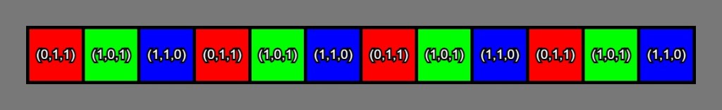 As can be seen in the pictures above, when we performed the step , the red color loses one peg while the blue and green gain one peg each. This is not exactly the black and white situation that we had with the dominos, but we can say something about this coloring – the parities of the three colors change together. In the example above, we started with the (red,green,blue) parity of (even,even,odd) and moved to (odd,odd,even). Any step that we will take will move between these two triplets. In particular, we can never end up using our rules with a one peg on the red color, since its parity triplet is (odd, even, even), and the same with green peg, but we don’t get any information on finishing with a green peg.