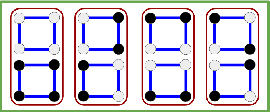 We already mentioned that these colored squares are almost invariant, but there is actually an even simpler property that we can see. The number of black and white vertices is always even, and while in the trivial function all the vertices are white, in the rest the number of black vertices equals to the number of white vertices. Now, after we moved to the values instead of