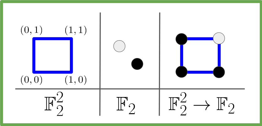 This is already a lot of interesting information, and we haven’t even started to look at the linear functions. The hope is that we can use each of these worlds of set theory, algebra and symmetry on these linear functions and combine it with what we saw on this larger set of all binary functions to produce some interesting results.