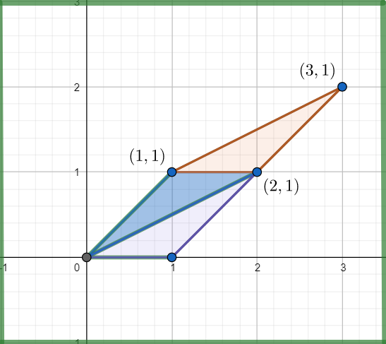 The first immediate result from this point of view, is that all of our parallelograms have the same area, no matter how many steps we take. Indeed, when we cut a parallelogram to two triangles and then glue them together, we do not change the total area. The second result is that all of our parallelograms don’t contain integer points in their interior (only their vertices are integer points). More generally, if is any set, and we look at its translate