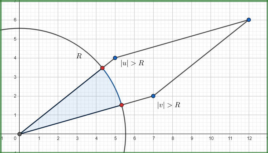to the origin (the green segments), and complete them to a parallelogram. The diagonal of this parallelogram (in red) is always inside it, and in particular between the two green lines, so when we project it onto