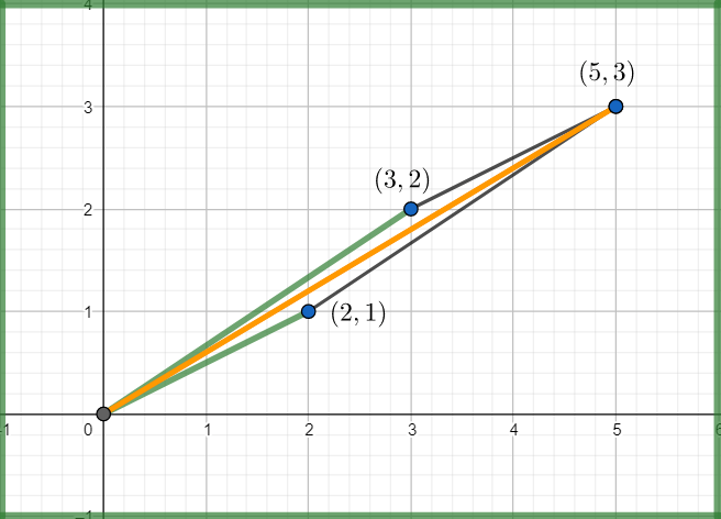 and taking the projection of both side gives us the original (not well defined) “operation”. So while in the 1-dimensional rational context the mediant is not well defined, we see that it is actually a shadow of a well defined 2-dimensional integer operation. In general, 2-dimensional objects might be harder to deal with than 1-dimensional objects, but in this case we also moved from rationals to integers, but even better – we have a nice visualization for this whole process.