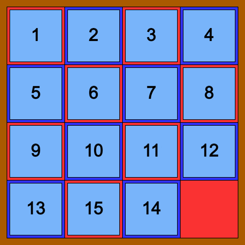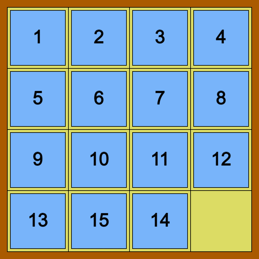Almost 150 years ago the game 15-puzzle was invented and quickly gain lots of popularity. The rules are quite simple – you start with a board with 15 numbered pieces as in the image below, where the pieces are ordered according to their numbers, except the 14 and 15 pieces which switch positions. Given this board we are allowed to slide into the missing place any one of the pieces next to it, how many times that we want, and we win if we manage to get all the pieces in the right order.